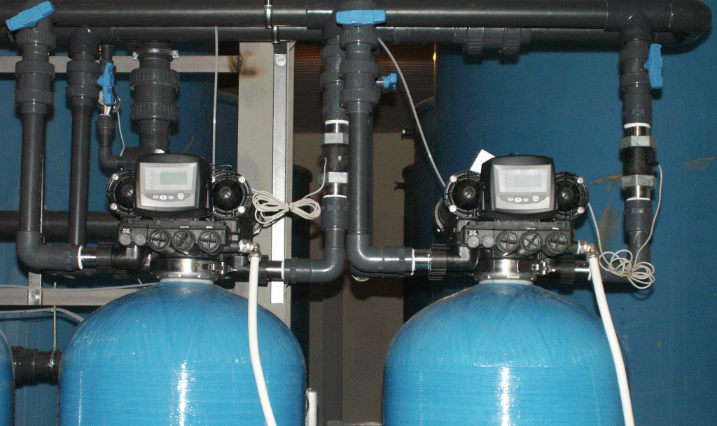 Система умягчения воды состоит из одного или нескольких натрий катионитовых фильтров. Два и более корпуса фильтра устанавливаются при необходимости обеспечения непрерывной работы системы. Например, установки серии TWIN предполагают собой два корпуса фильтра и один общий блок управления. При такой конфигурации осуществляется режим по типу "качели", при котором одна колонна находится в рабочем режиме а вторая в режиме ожидания. При выработке ресурса ионообменной смолы одного фильтра клапан переключает подачу воды через вторую колонну, одновременно переводя первую в режим промывки а затем режим ожидания.Предназначен для переключения режимов работы и промывки без присутствия оператора, периодичность и время начала промывки настраиваются. В бытовых системах на время промывки подача воды не прекращается в соответствии с нормами безопасности, в промышленных системах во время промывки подача воды через фильтр находящийся в режиме промывки останавливается.