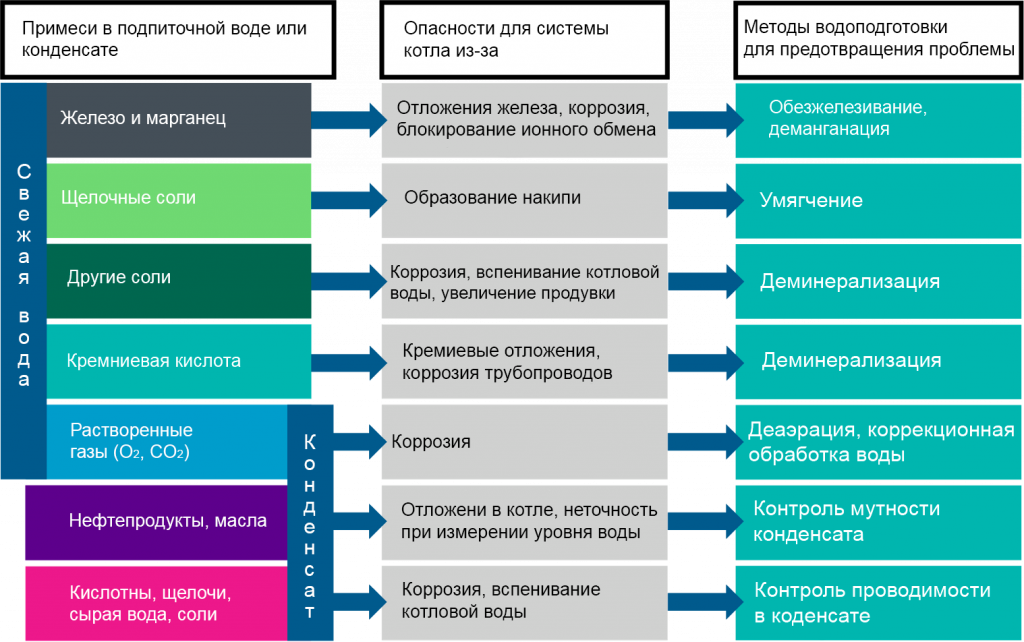 В обоих случаях вода используется в качестве основного исходного сырья для процесса. Почти все проблемы в котельных системах, связанные с преждевременным выходом из строя водяных и жаровых труб, неожиданным снижением энергоэффективности и отказом системы, связаны с химическим составом воды. По этой причине использование системы водоподготовки для котельной является обязательным для надежной, долговечной и эффективной эксплуатации котельных агрегатов.