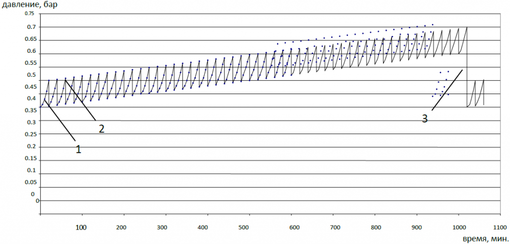 На циклограмме работы установки ультрафильтрации показано увеличение перепада давления в зависимости от времени и следующие рабочие процессы:1 – Процесс фильтрации. Во время цикла фильтрации на мембранах накапливается осадок и растет перепад давления. В данном примере, в течение 20 минут, перепад давления изменяется от 0,4 до 0,5;